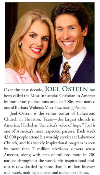 Joel Osteen is the senior pastor of Lakewood Church in Houston, Texas. Listed by several sources as America's largest and fastest-growing congregation, Lakewood church has approximately 45,000 adult attendees every week. Millions more watch Joel's messages as they are broadcast on national and international television networks. He resides in Houston with his wife, Victoria, and their children. You can visit his Web site at www.joelosteen.com.